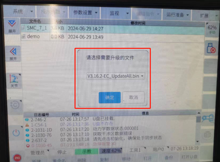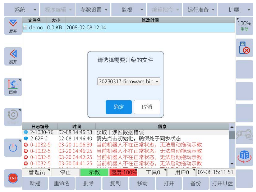 2.1.5 把U盘插到控制USB口上面,点击系统---机器人升级----系统升级---选择要升级的文件---点确定,等待几分钟升级完成后,系统会自动重启。