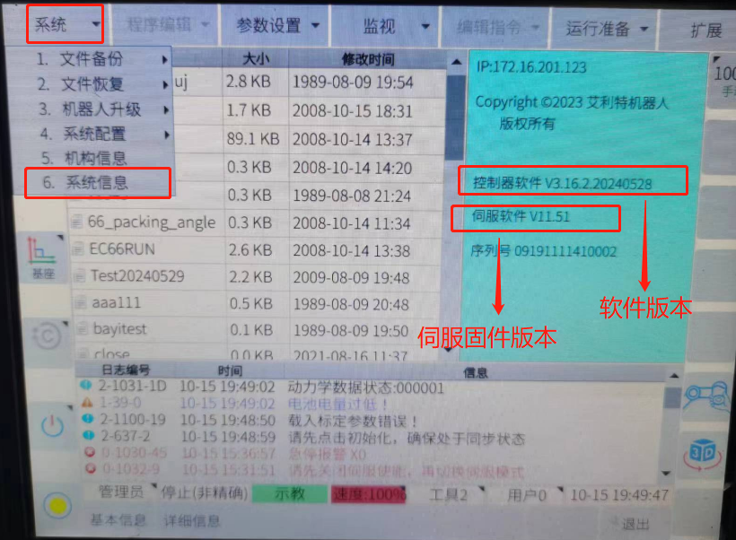 问:    如何确认机器人当前软件版本及固件版本?