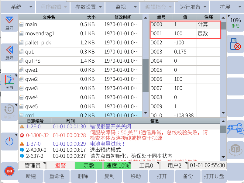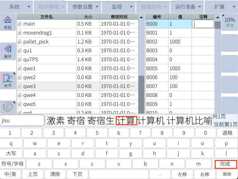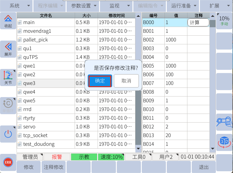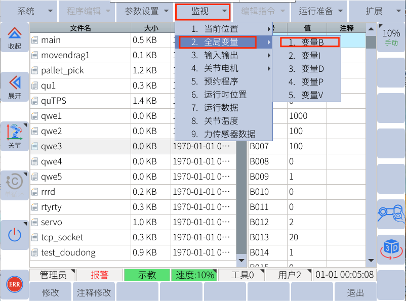 机器人在调试过程中经常会使用到全局变量和IO信号,在手动测试过程中为防止忘记变量和IO信号的功能,一般会在后面增加对应的注释,EC示教器上的全局变量(D,B,I,V,P)均可以人为修改注释(支持各类语言),数字IO,模拟量IO,M虚拟输入和输出也均支持修改注释