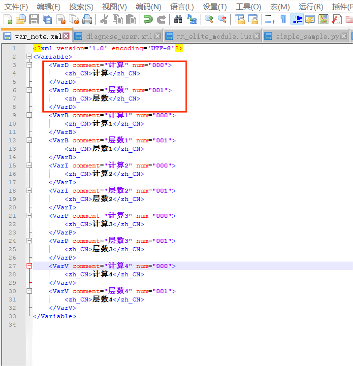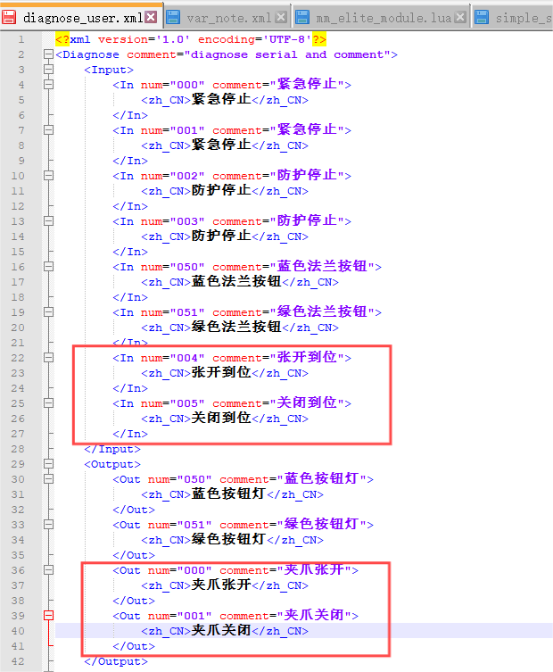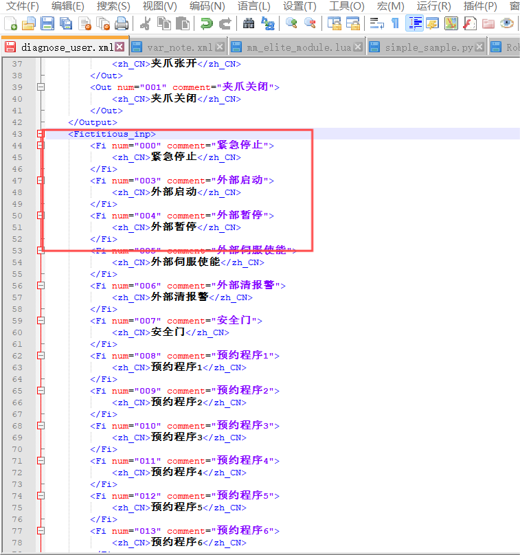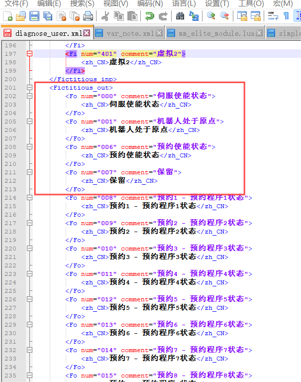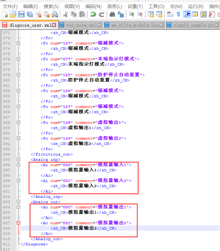 6)diagnose_user.xml文件打开后,根据需要可在文件下进行对应数字、虚拟、模拟量的输入输注释修改
