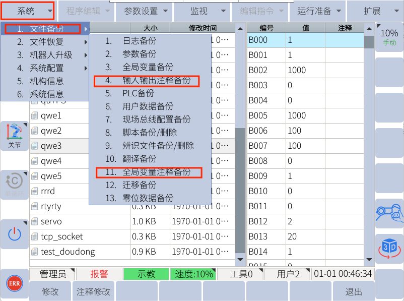 3. 示教器上导航至系统-文件备份-输入输出注释备份-全局变量注释备份