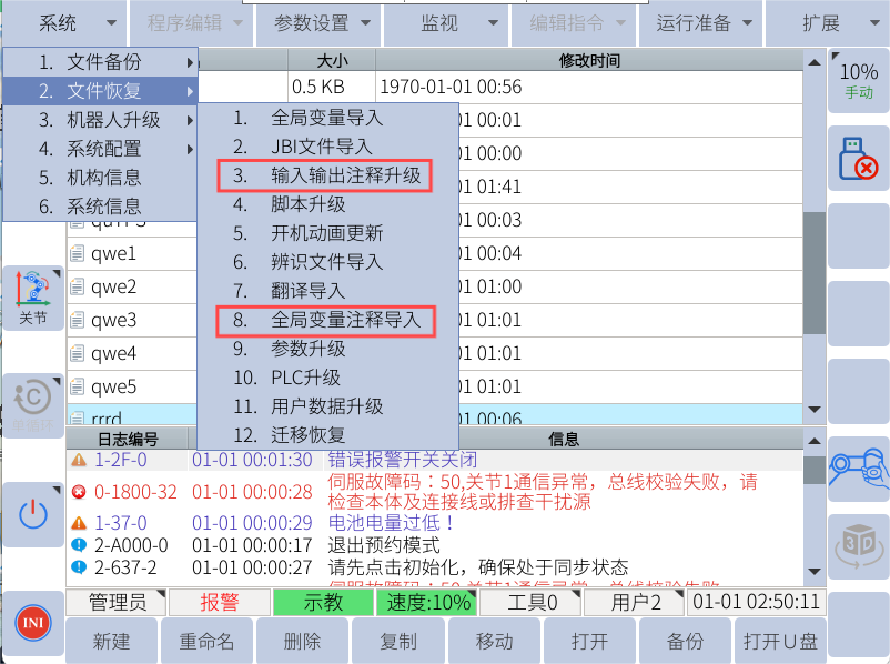 1.操作文件备份或者恢复时,示教器上无全局变量注释或者输入输出注释的选项