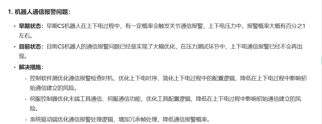 (14)是确实通信质量比较差,不定期的偶发通信,这种可能是硬件存在问题,此类报警如果还伴随这样的日志产生,那可以明确通信质量有问题。可以先尝试通信插拔通信线,航插等接口,然后再验证是否还存在问题。持续存在的话,可能就是硬件故障了。