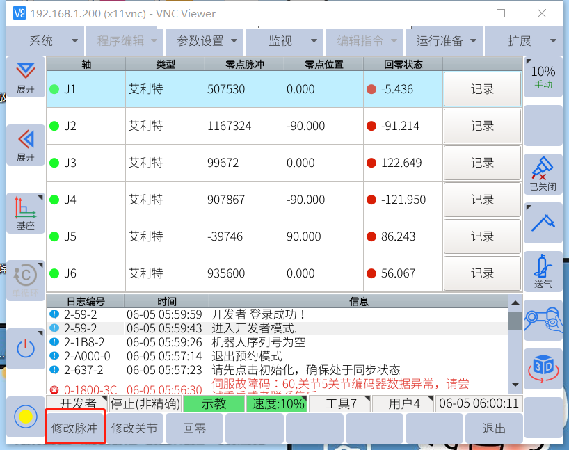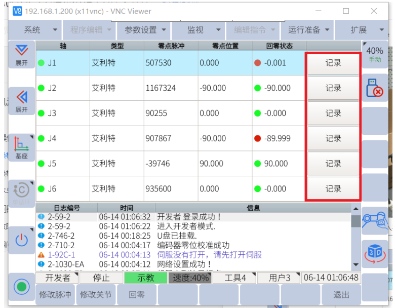将套圈超限的关节角度置零位 先用手机对零点界面拍照,把六个关节的零点脉冲都拍照记录下来。然后在示教器上对套圈超限关节点击记录。这时该关节角度会变成零点位置的角度,且该关节的零点脉冲值会改变,机器人可以手动运行。