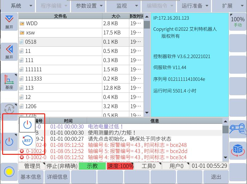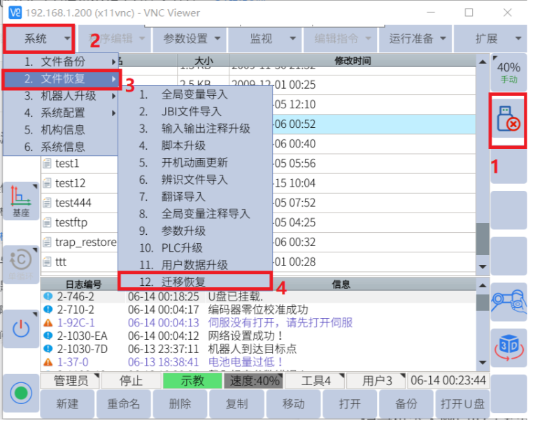 文件恢复,将保存备份文件U盘插入控制柜。示教器界面点击系统-文件恢复-迁移恢复,提示完成后恢复使用。