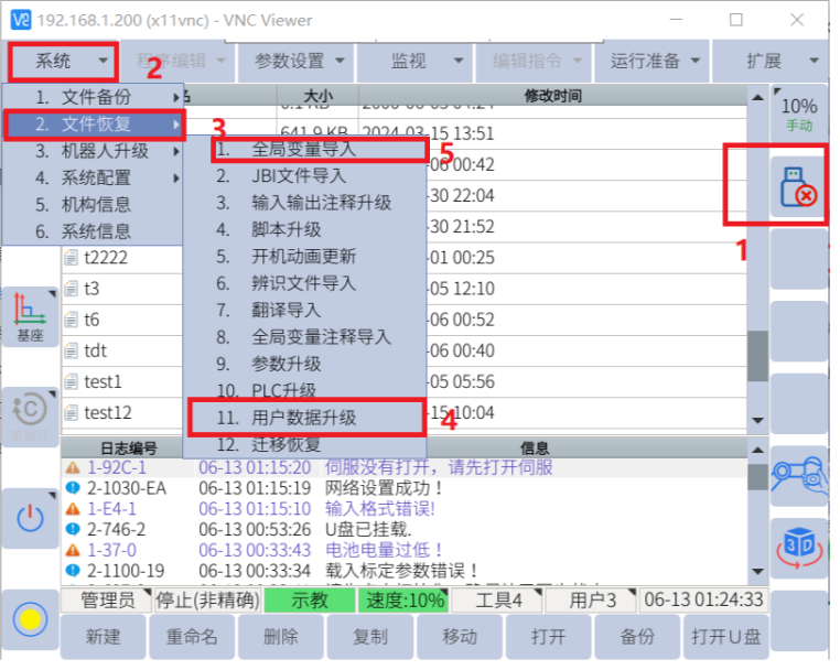 更换好成套机器人后开机将原来程序数据导入新机,将存有文件U盘插入控制柜,示教器界面点击系统-文件恢复-用户数据升级和全局变量导入