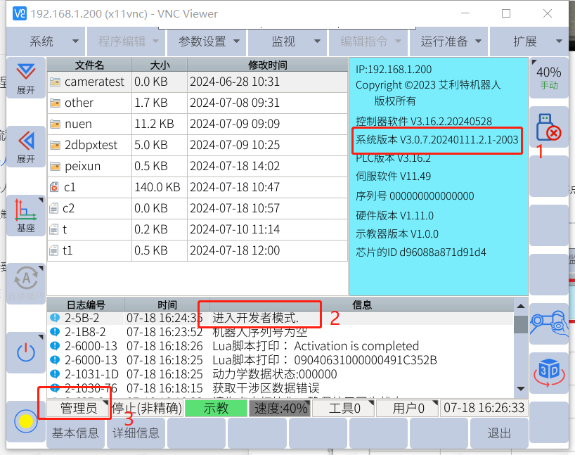 多次点击系统版本触摸位置,等待提示框出现进入开发者模式。点击管理员切换开发者模式,登录密码123456.