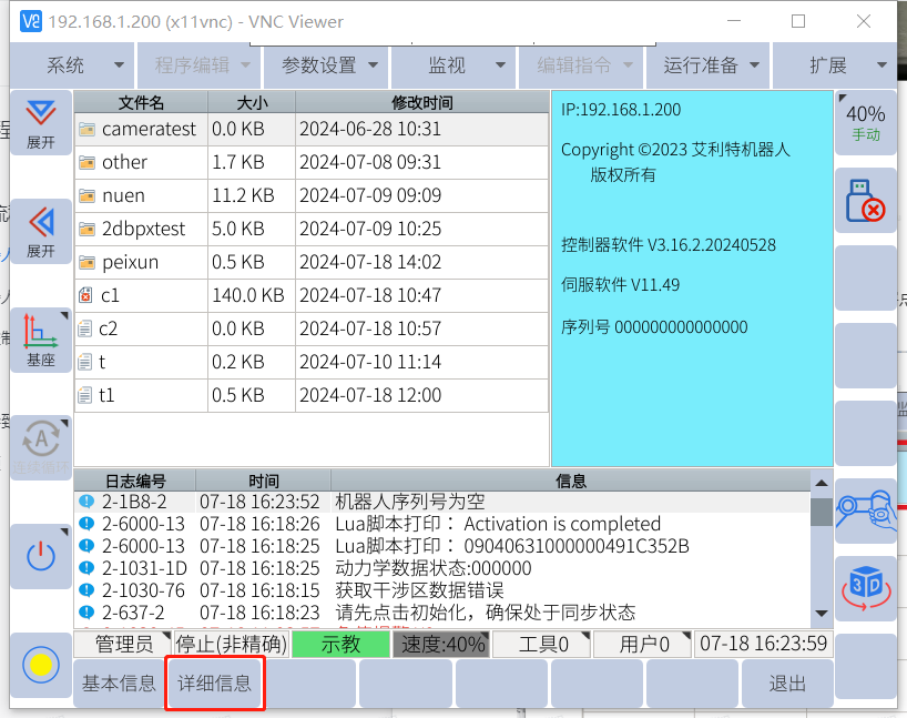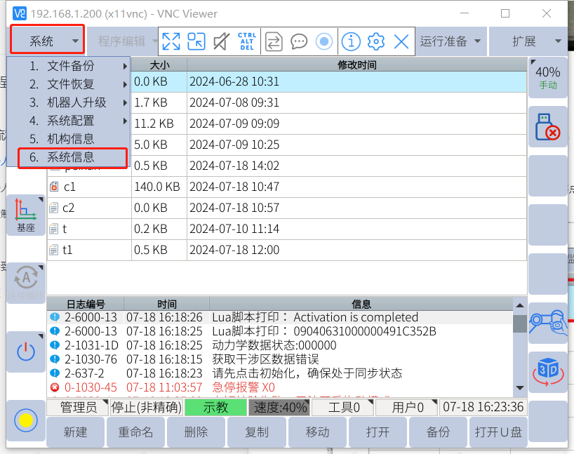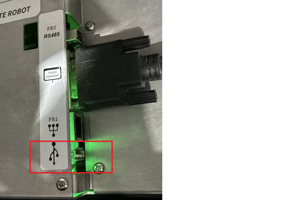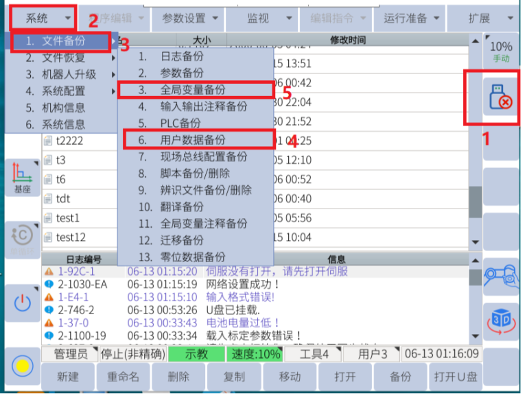 将U盘插入控制柜USB接口,确保U盘正常识别,示教器界面点击系统-文件备份-备份用户数据备份及全局变量备份。记录机器人网口IP,主程序名。(单独记录)