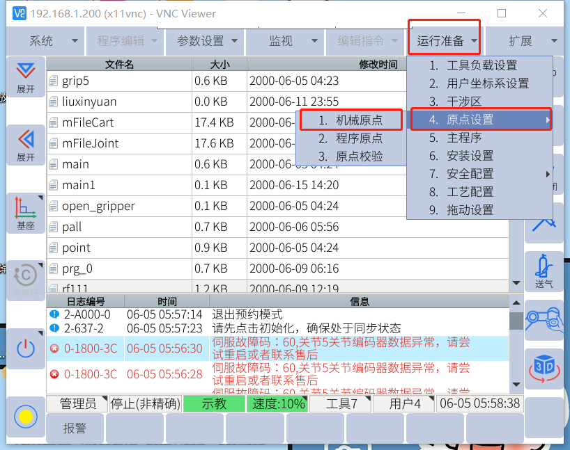 进入开发者后。点击运行准备-原点设置-机械原点,将拍照记录的新机零点脉冲-DH参数重新输入后记录。修改零点脉冲步骤如下
