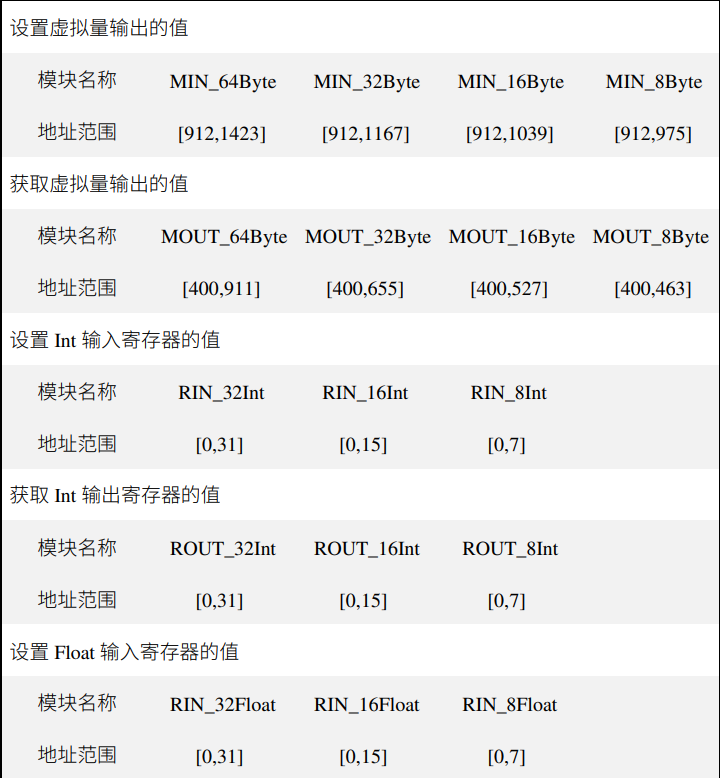 模块功能及对应的控制器的 M 变量或 profinet 寄存器的地址范围具体如下: