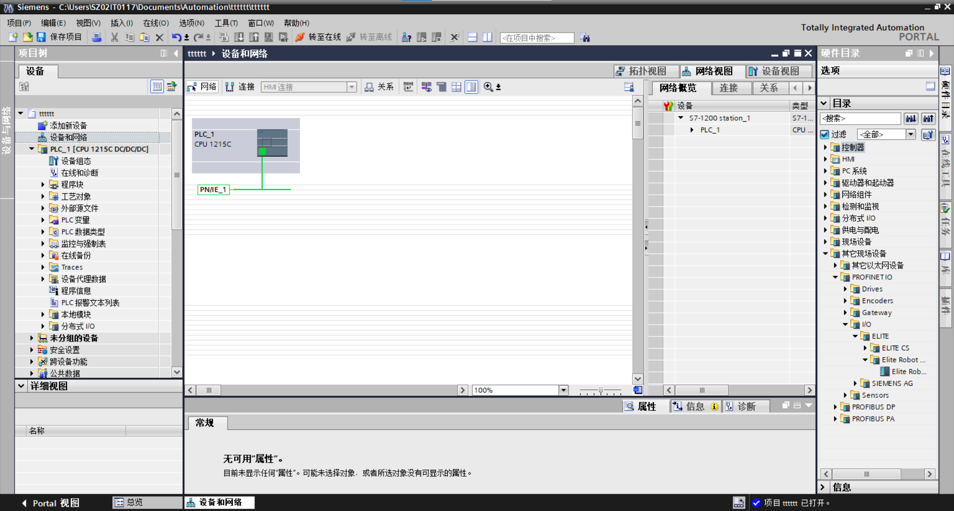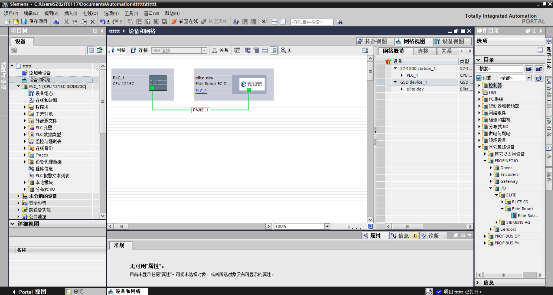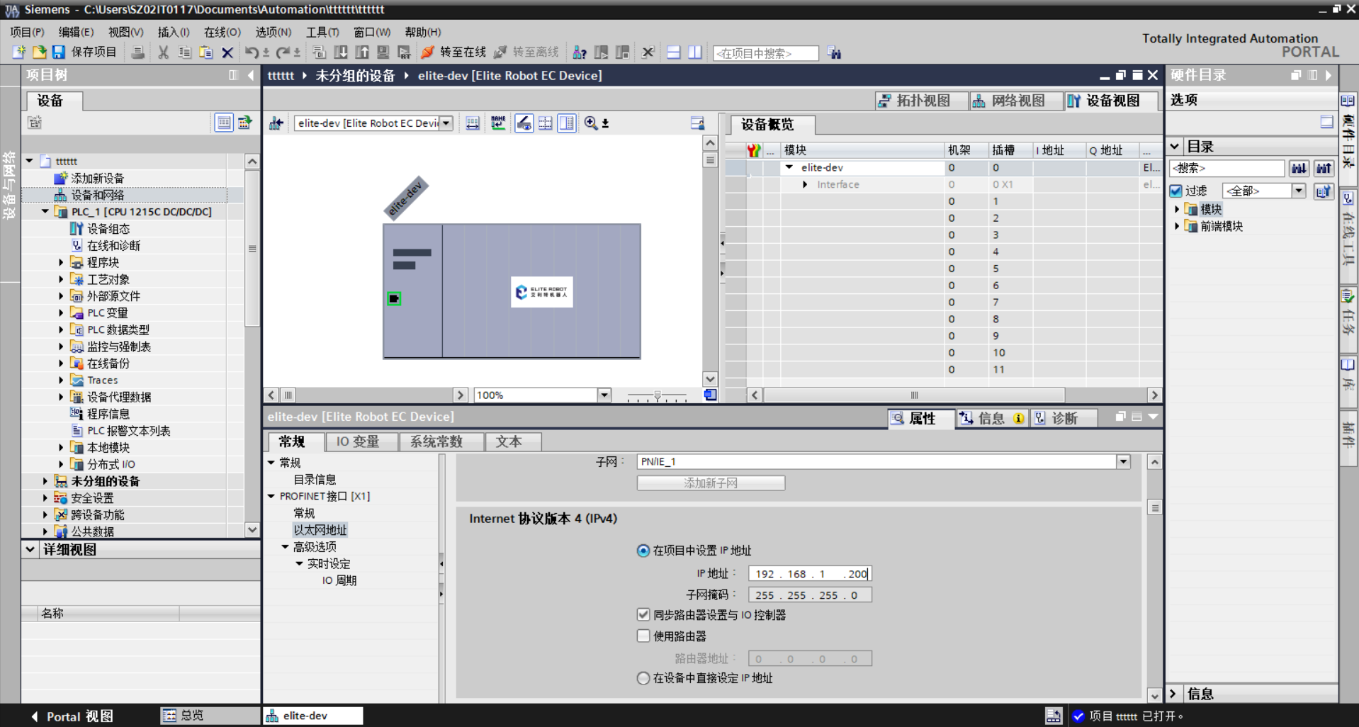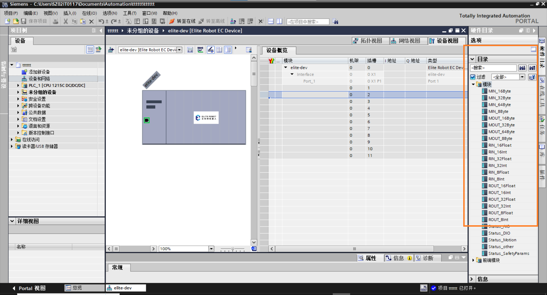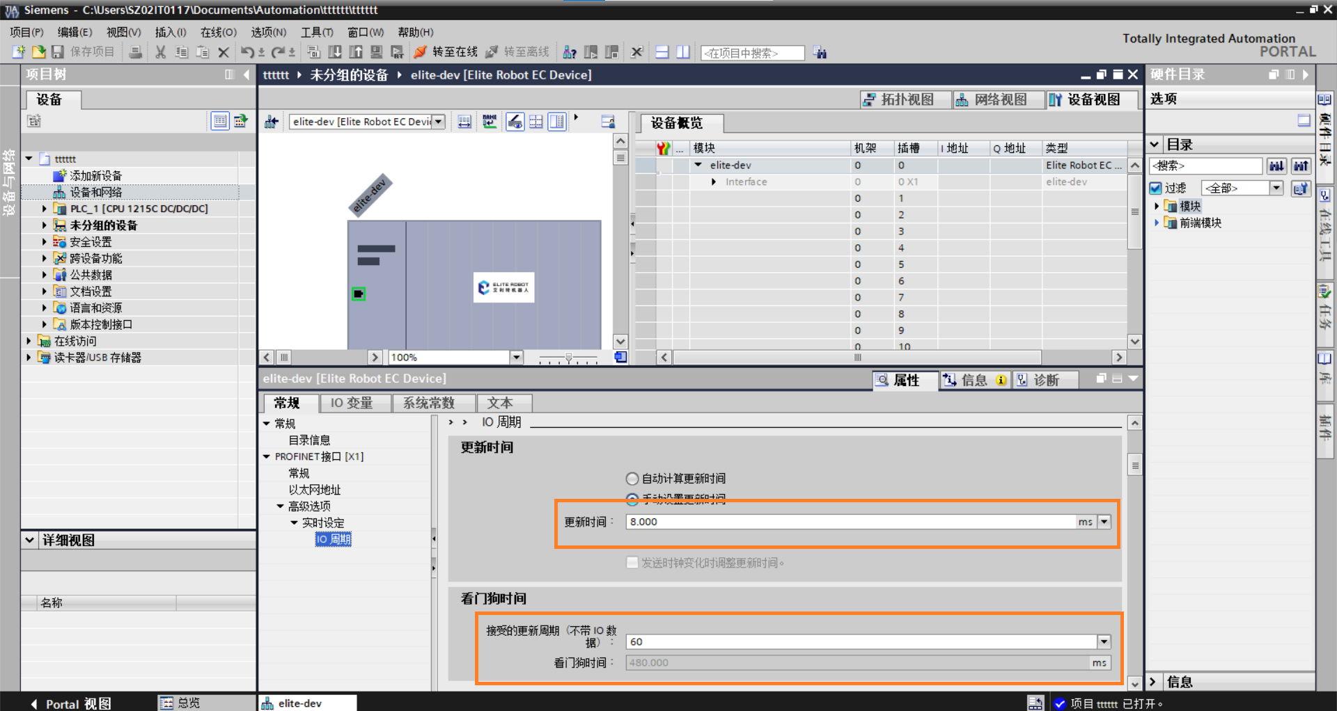 2. 添加 Elite Robot EC Device 到设备和网络,点击左侧设备和网络,进入页面,在右侧目录栏找到其他现场设备-profinetI/O-IO-elite,找到elite robot EC Device如图 3-3 所示。