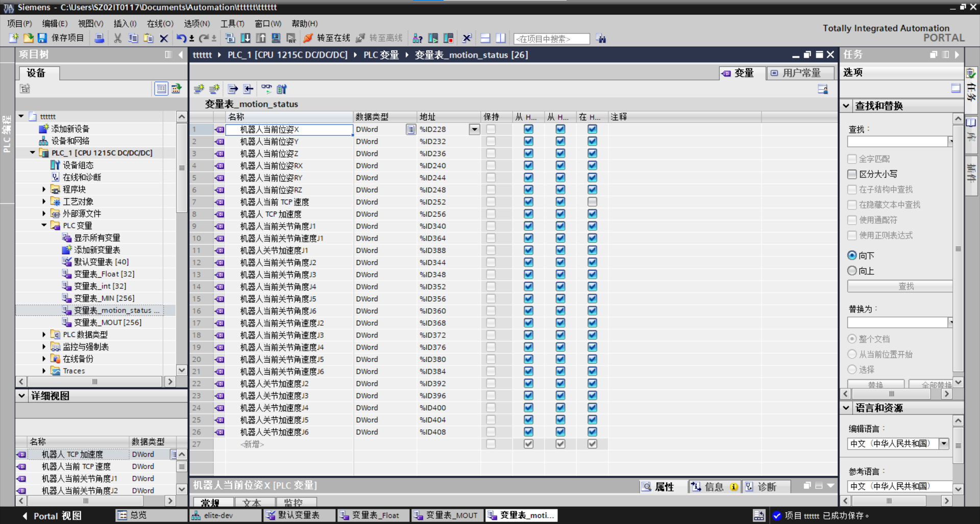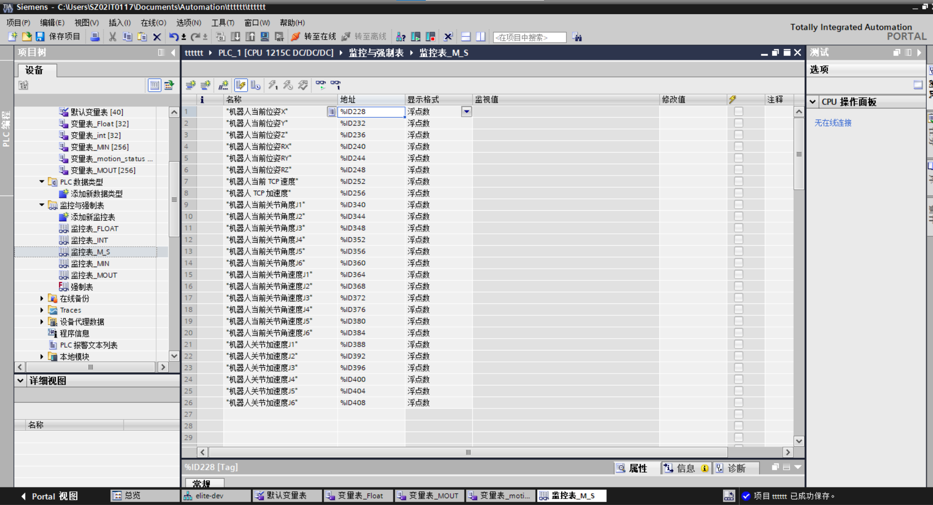 8. 添加完成之后,下入PLC,转至在线即可开始监视机器人状态与M变量。(32位以上要重启机器人,否则PLC会报错下位组件错误)。