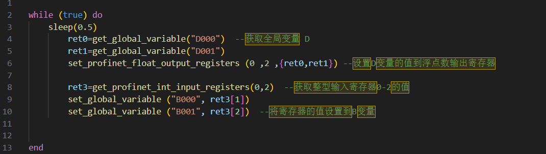 此脚本为简单的示例脚本,机器人将D变量浮点数传到PLC对应地址前两个寄存器,plc将两个正整数传入机器人B变量。更多脚本指令,请查找EC脚本手册profinet通讯章节。