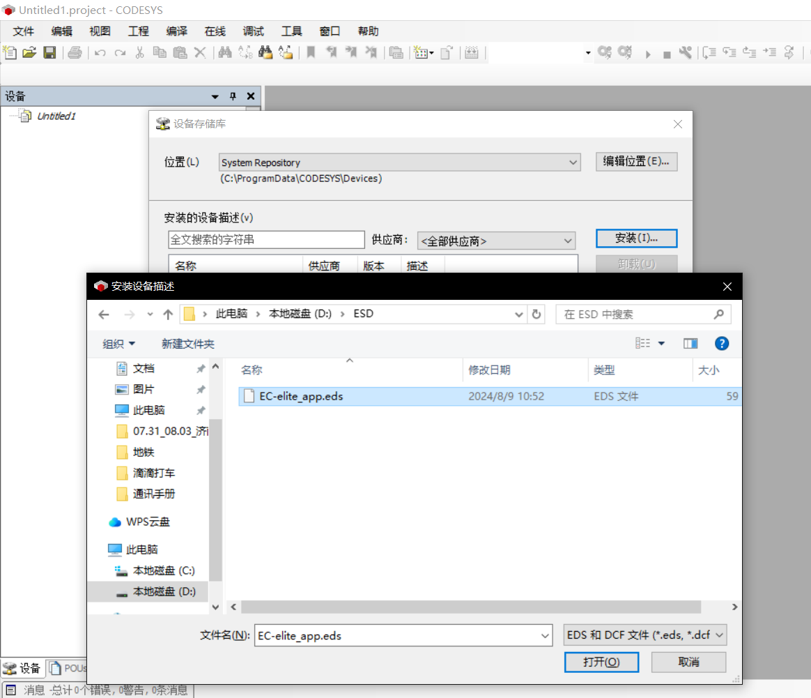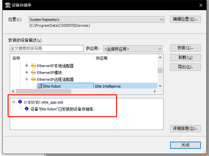 加载安装 elite 的EDS 文件,在 Codesys 菜单栏-工具-设备存储库,点击安装,导入附件中对应 EC 机器人 eds 文件。导入后文件会出现在 EthernetIP 总线下,同时显示文件已经安装到设备存储库