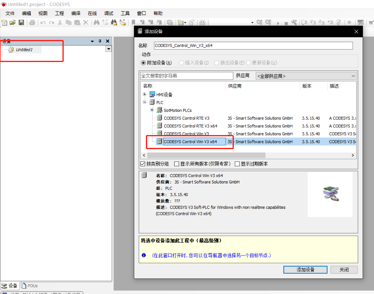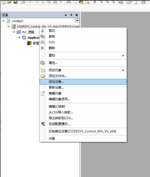 选择新建设备 Untitled1,右键点击添加设备,选择对应的 CODESYS Control Win V3 X64 中的 PLC,点击添加设备