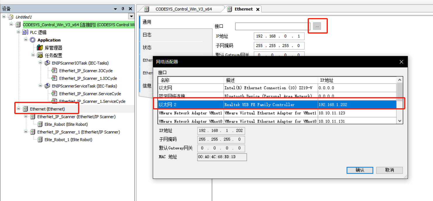 设置 Ethernet 主站 IP 地址,双击 Ethernet,选择通用中的“...”,选择对应的以太网,如下图所示