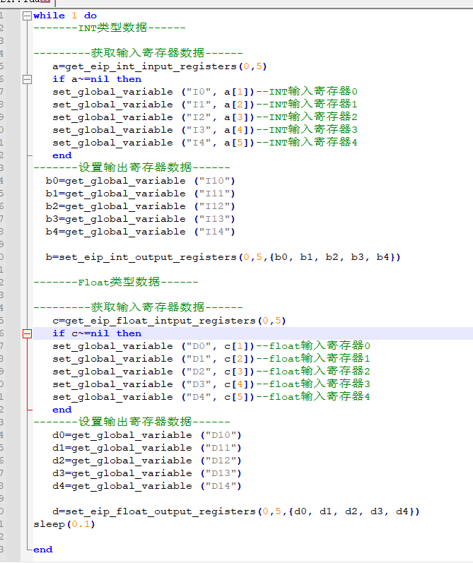 机器人导入脚本并运行,关联各 5 个 INT 输入输出和 Float 输入输出,脚本如下所示(具体释义可参考 LUA 脚本手册)