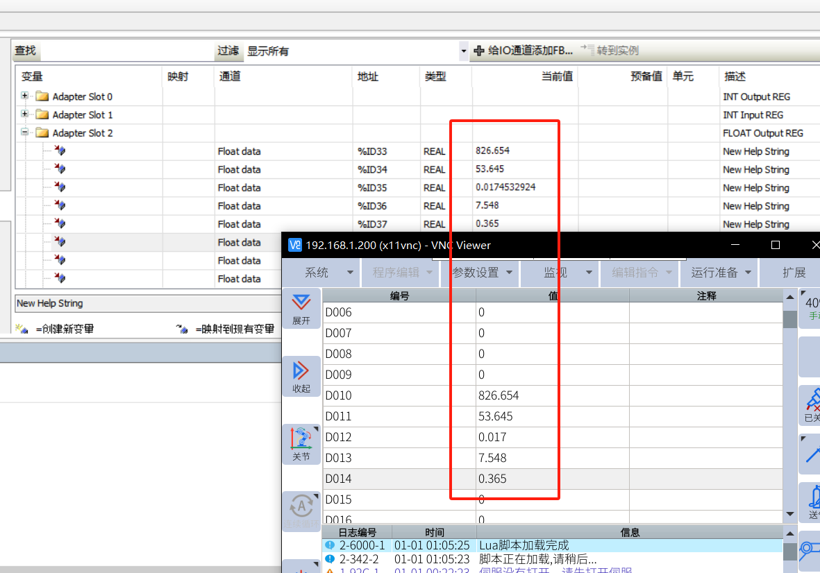 Float 输出,将机器人数值发送到 codesys 变量,D010-D014 关联到 Adapter Slot 2 输出前 5 个数值,数据变化一致