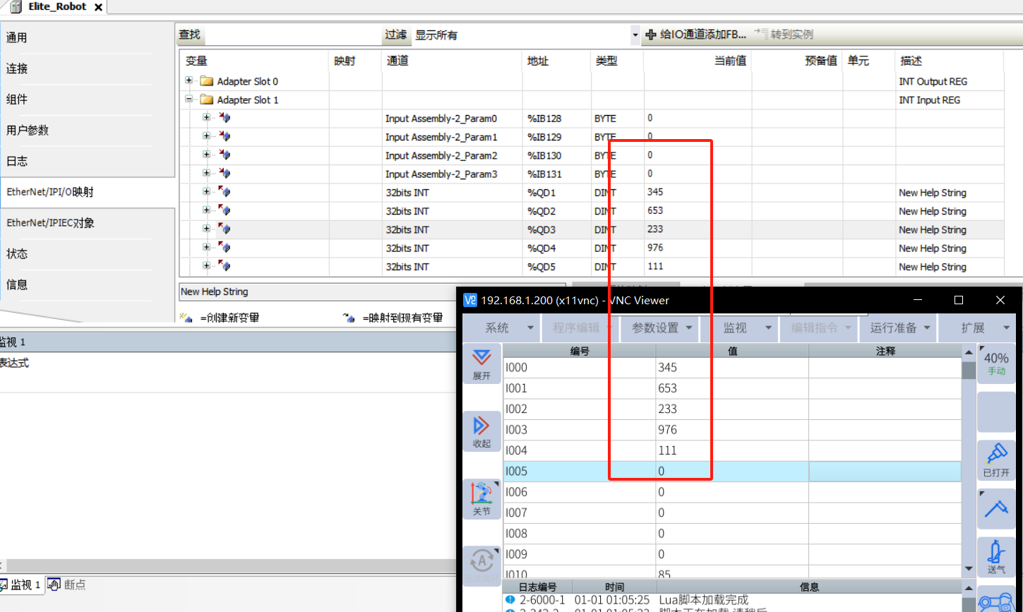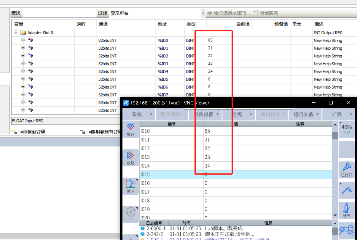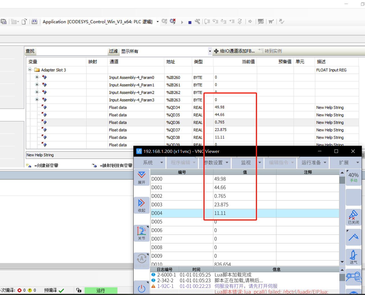 Float 输入,将 codesys 数值发送到机器人变量,D000-D004 关联到 Adapter Slot 3 输入前 5 个数值,数据变化一致