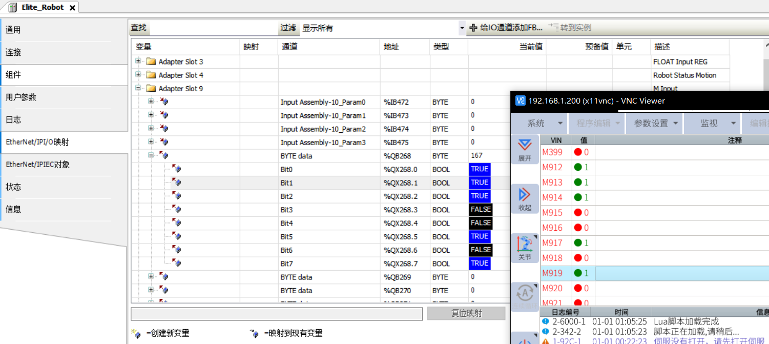 M 虚拟输出,将机器人 M 虚拟输入变量数值发送到 Codesys 的 BOOL 值,M400开始的 M 关联到 Adapter Slot 10 输入的 BOOL 值(具体参考 Adapter Slot 10 定义数值),数据变化一致