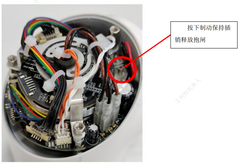 4.  V3.1 以下版本无反向驱动模式,如遇紧急情况请立即按下紧急停止按钮切断电源,移除相应的关节盖,并释放制动保持插销,让关节自由移动。
