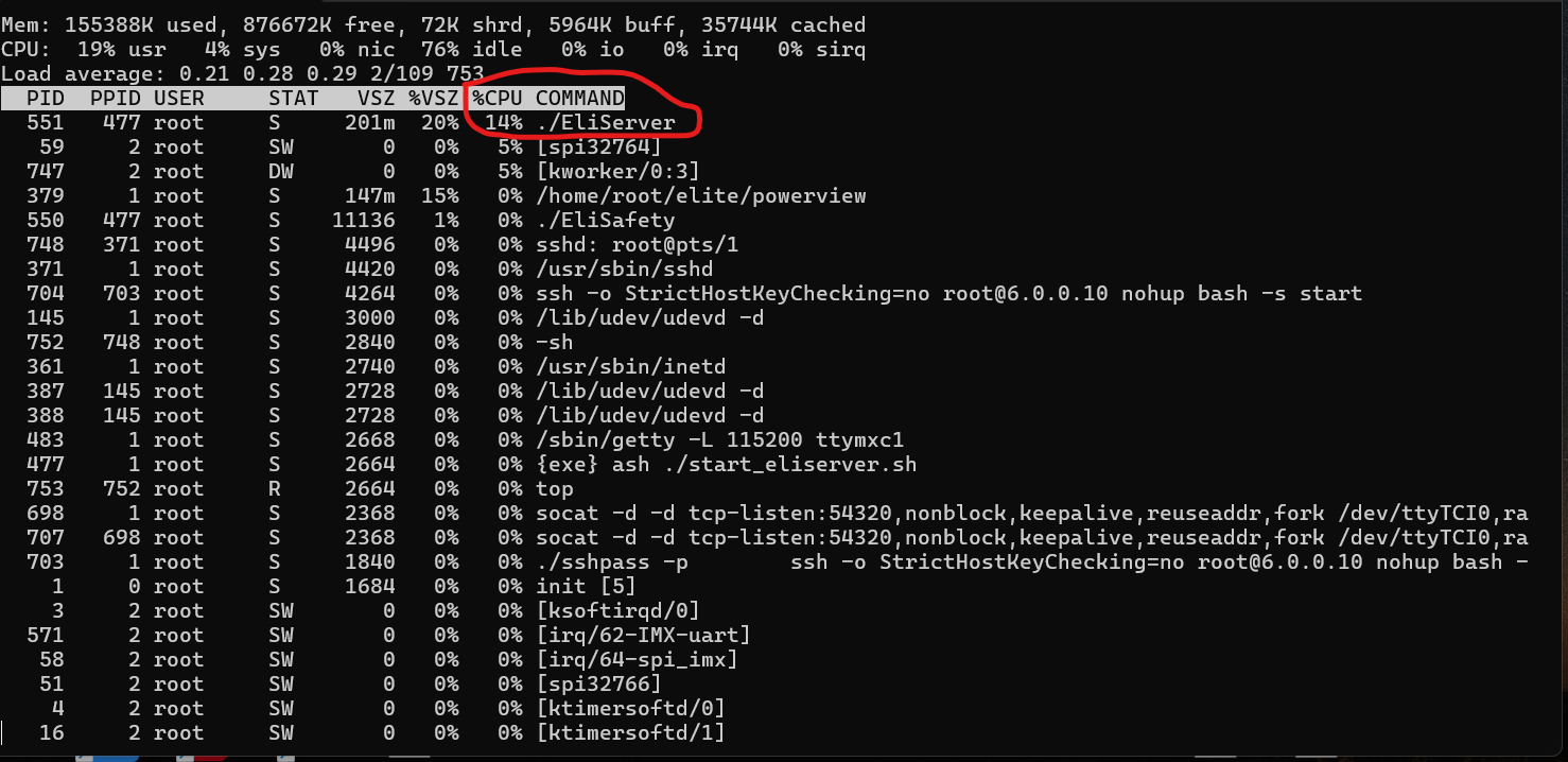最后在终端内输入:top 即可查看当前的cpu占用情况。主要看command为Eliserver的应用的cpu占用情况。划线位置,如果超过60%则说明CPU超负荷,可能会出现机器人抖动异常等情况。