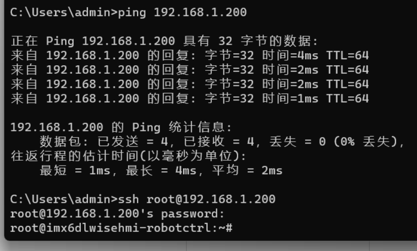 如果机器人与电脑可以ping通,则使用ssh登入机器人终端,ssh root@机器人ip。如下图:
