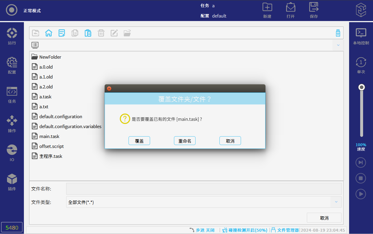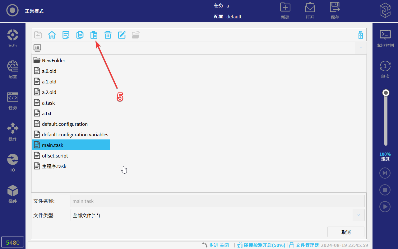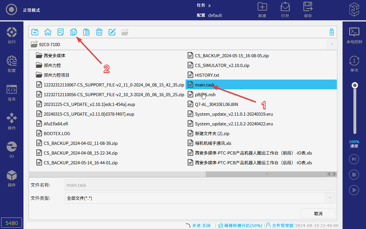 CS机器人示教器软件界面下方内置有文件管理器功能,该功能可以管理程序文件、配置(全局变量)文件和脚本等内部文件,以及可以管理外部存储介质U盘文件;