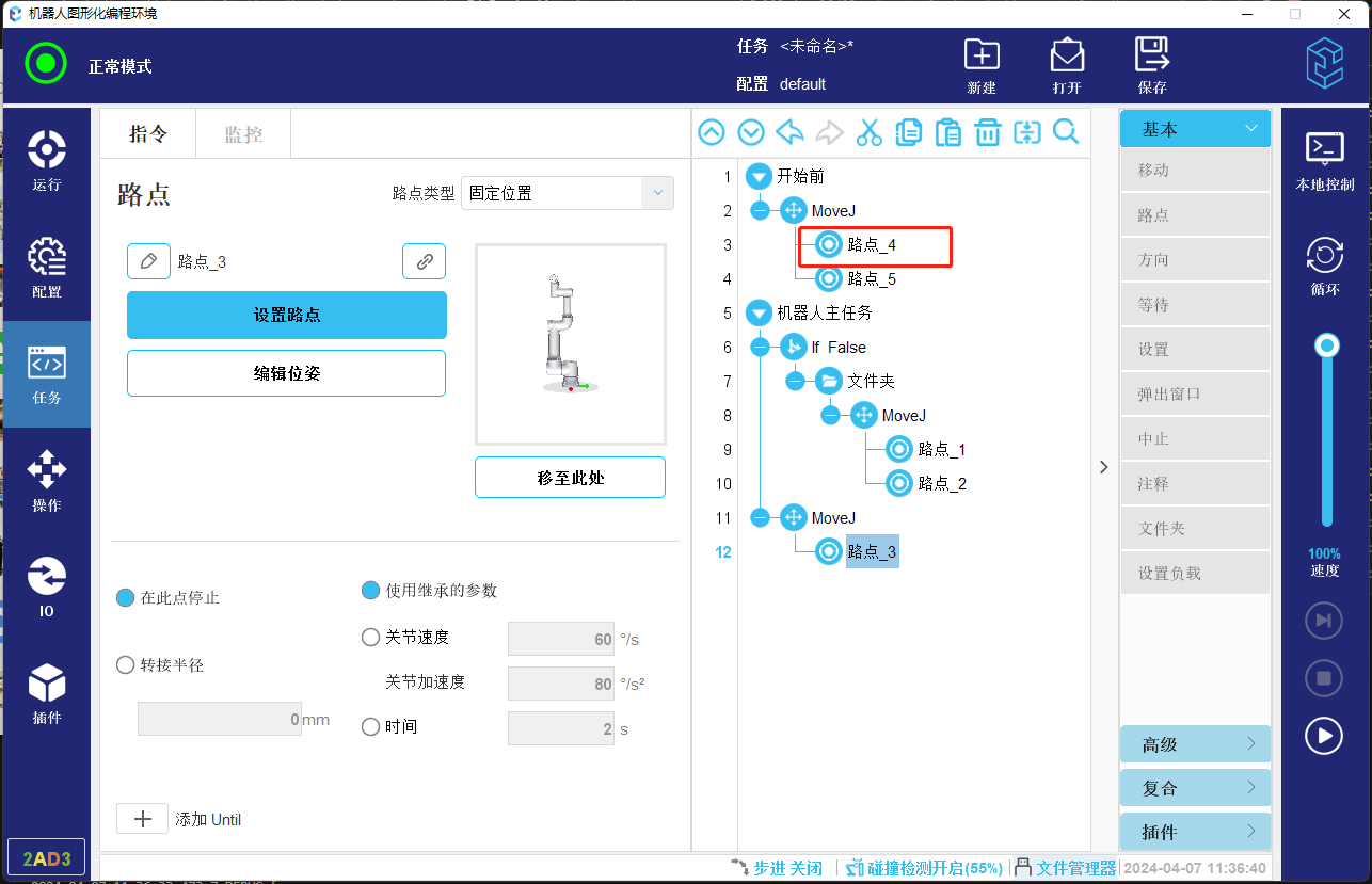 3. 如果任务存在开始前序列,则不论是从头开始运行任务还是使用任务的任意行运行功能从任务中间行运行任务,都会优先从开始前序列中正向查找起始的安全位置,比如图-4所示的任务,不论任务是否从头运行,都会找到路点_4作为起点。