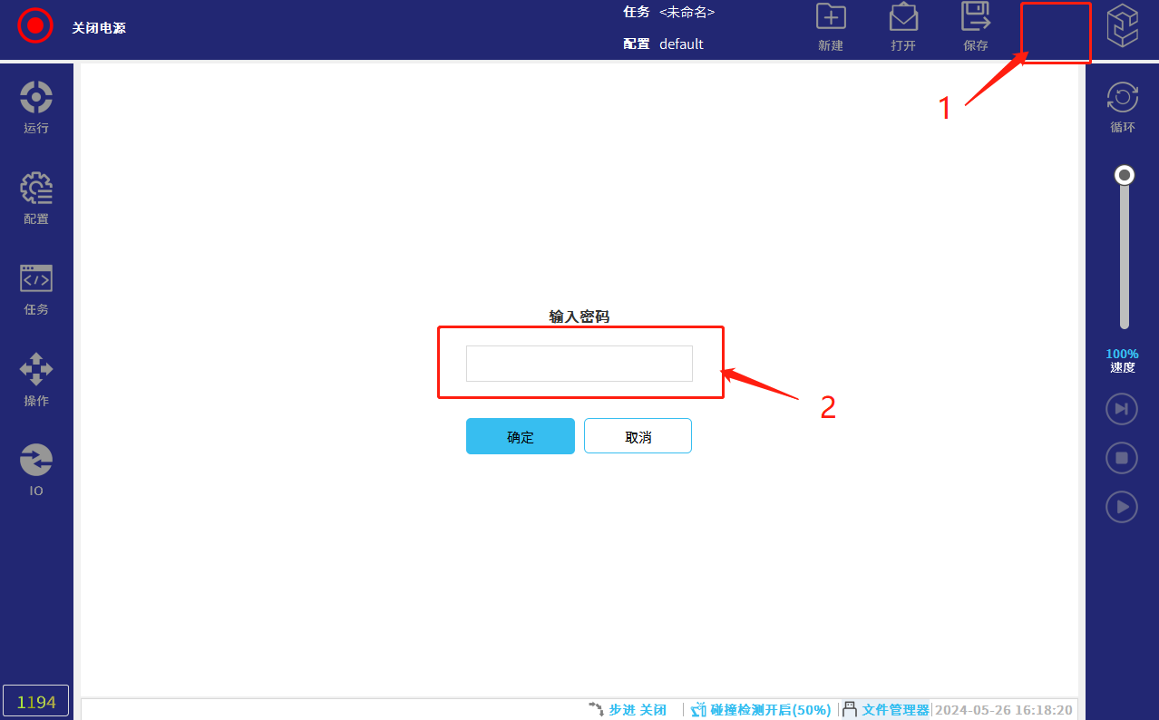 - 在正常模式下点击下图所示右上角红框1标注区域(连续快速点击 5-8 次)就会出现输入密码页面界,红框2点击输入密码:elibot,进入专家模式;