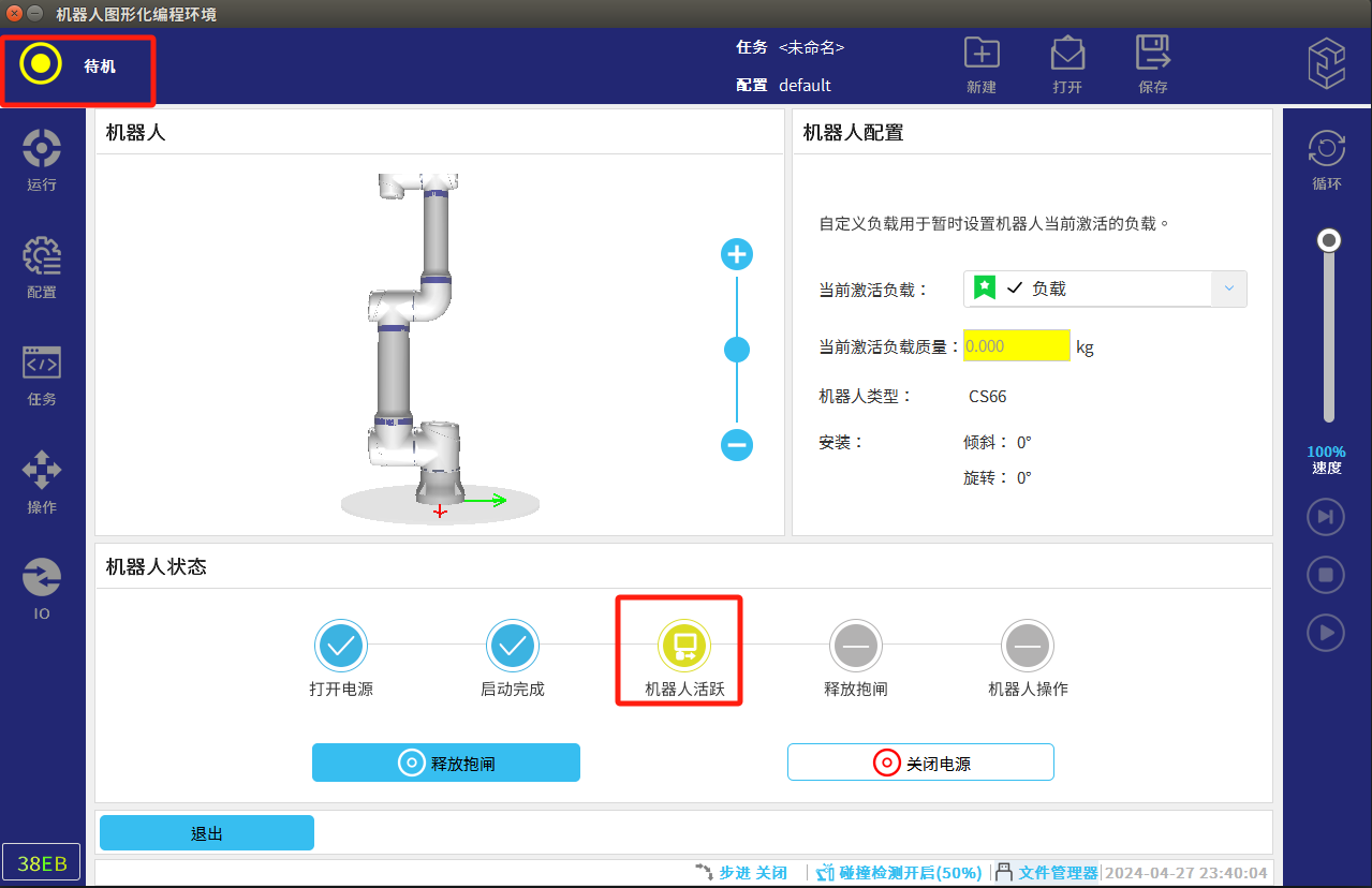- 机器人显示”待机“状态后退出,进入运行页面,切换状态