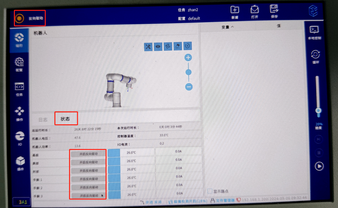 按住示教器反面的拖动使能开关,机器人即进入 “反向驱动”模式。点击开启对应轴的”反向驱动“,