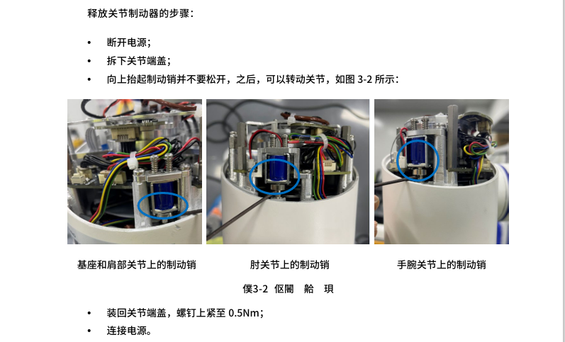 - 伺服关节损坏报警异常后无法通过以上松开抱闸方法操作,需手动松开,具体参考CS服务手册操作指南