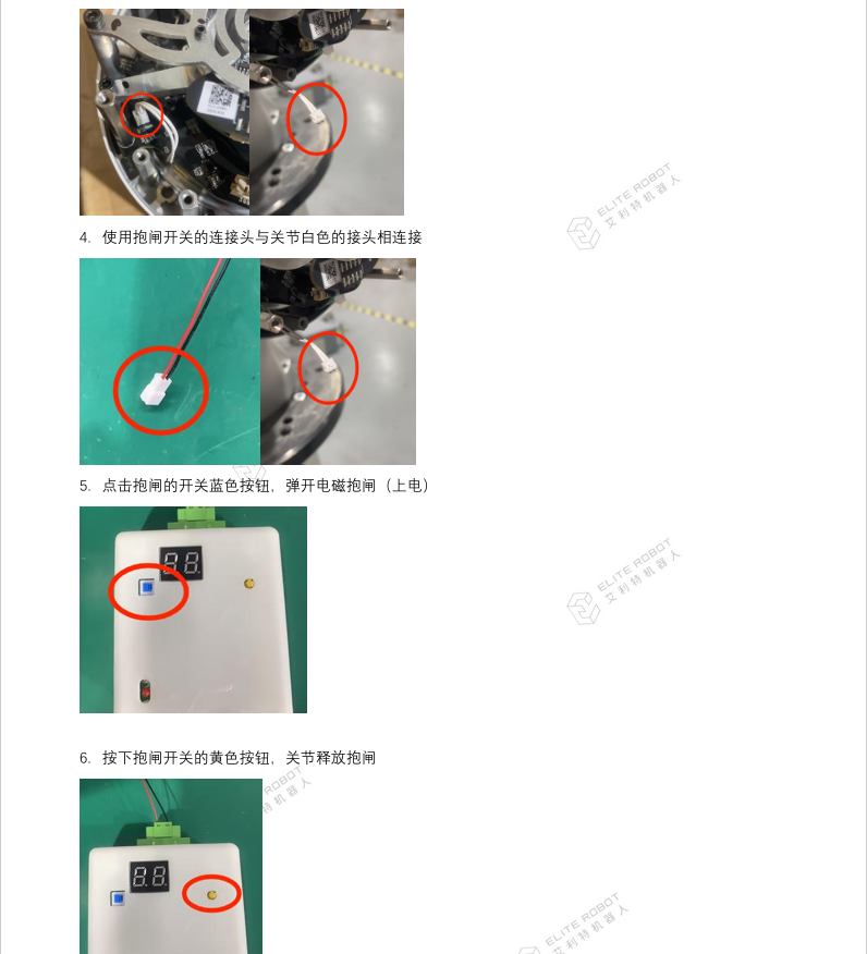 - 机器人触发急停后,电磁式抱闸不会活动,插销式有小范围活动,因此也可以通过触发机器人急停来判断关节抱闸类型;