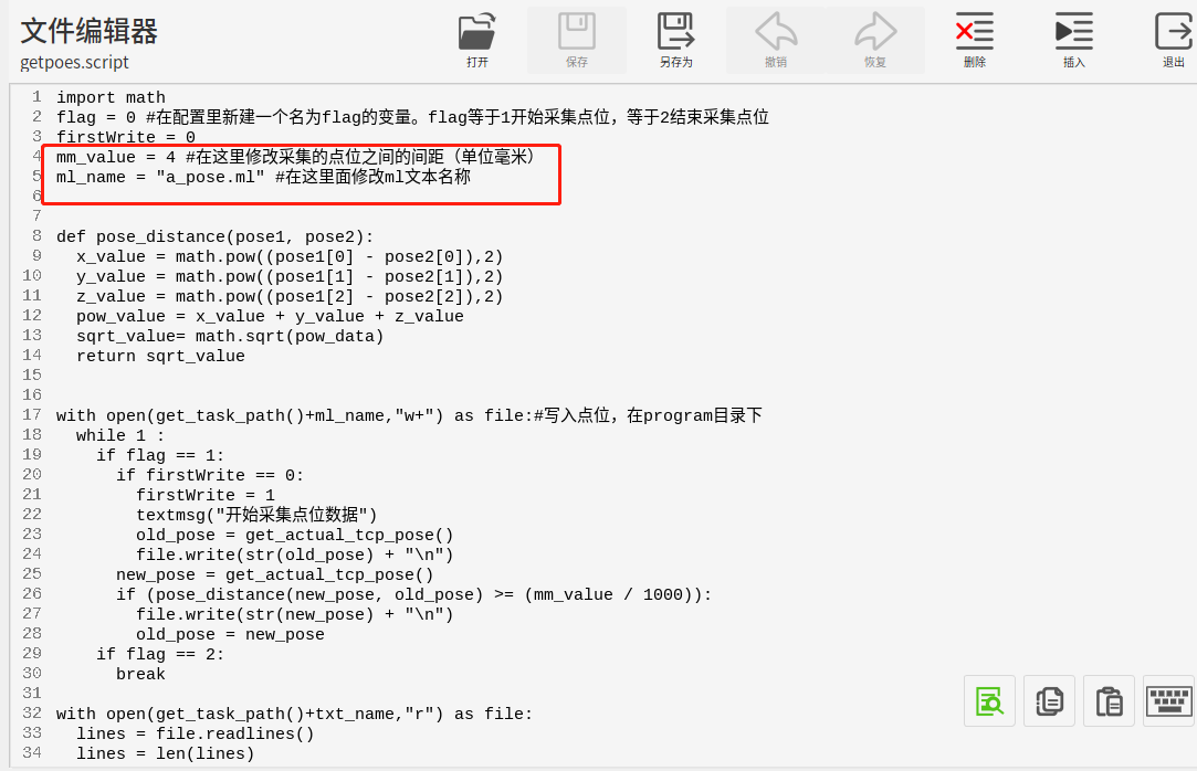 3.脚本说明:可在红框处修改采集的点位间距和ml文件的名称。