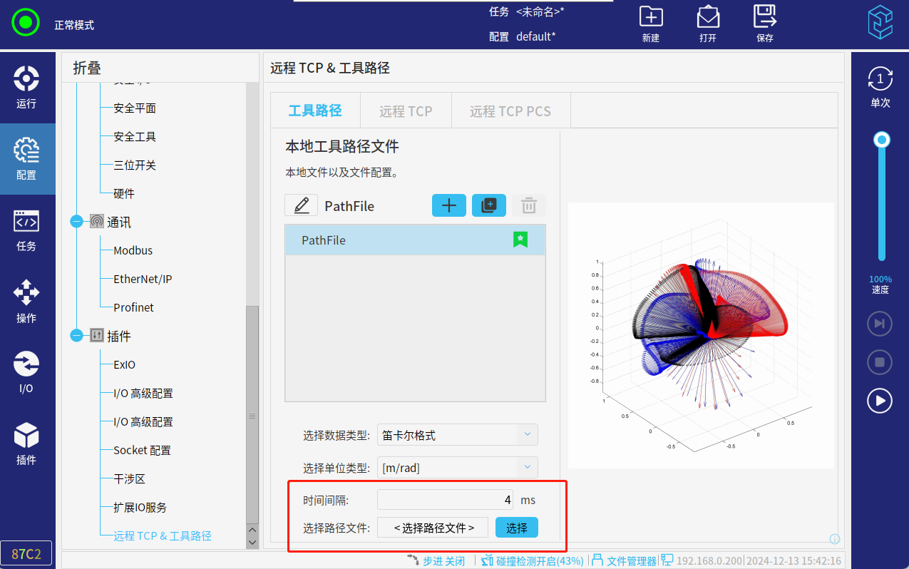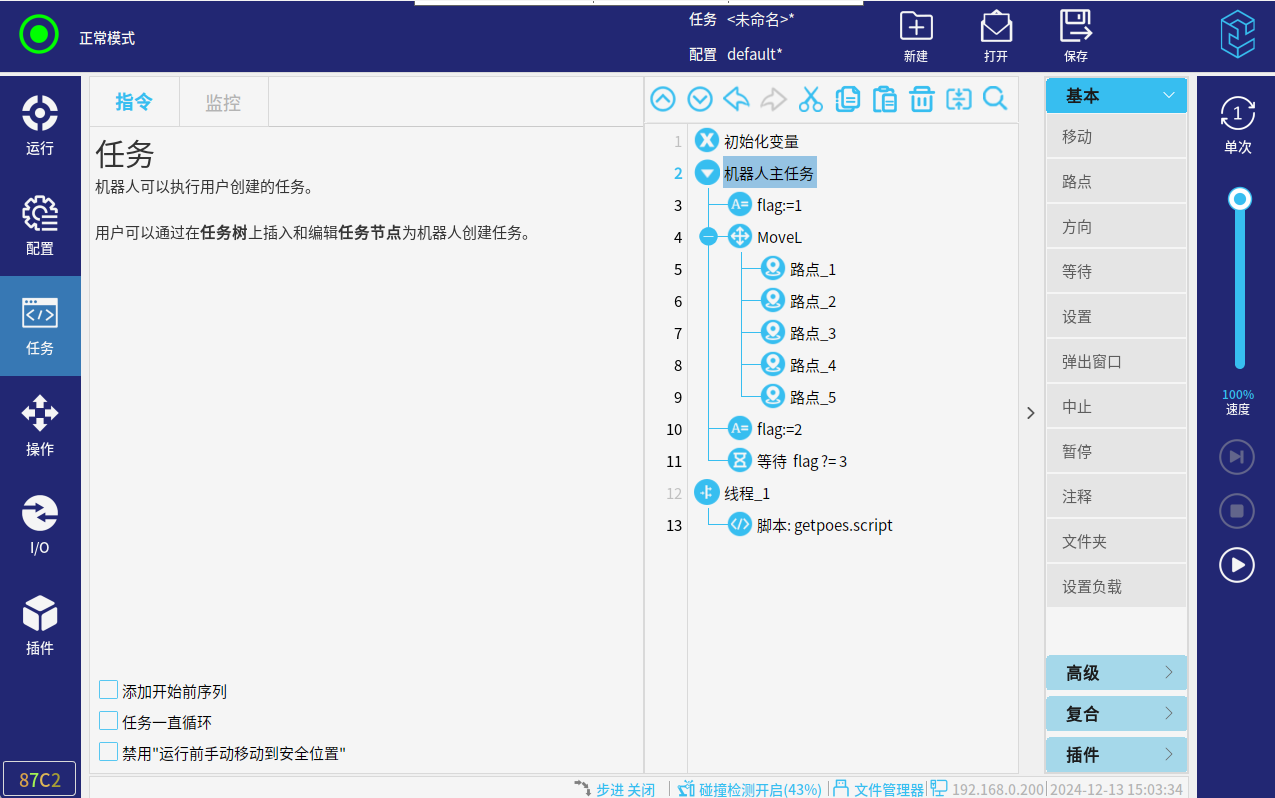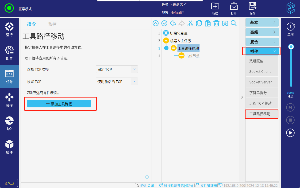 3.以上操作完成后,就可以运行程序了。初次运行,速度百分比调低一点,插件参数设置的不对,运行过程中可能会有抖动。