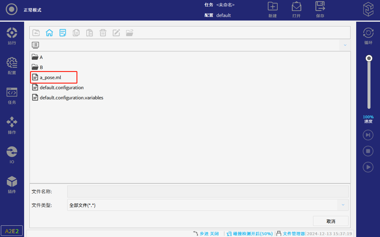 4.执行机器人程序,机器人的运行速度百分比可以调到20%以下。执行完成后,会在在如图片所示的目录下生成一个.ml后缀的文件。