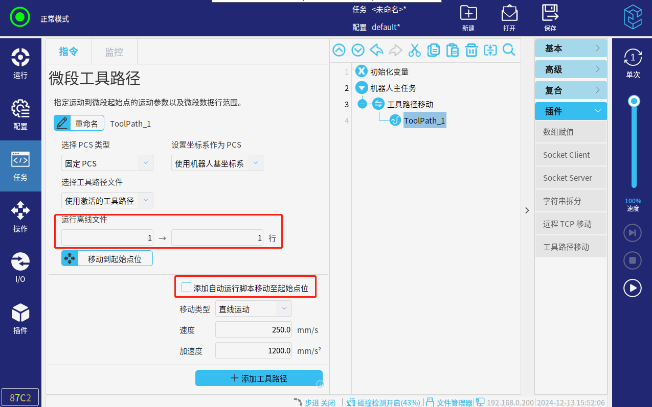 2.在运行离线文件处,可以修改ml文件一共要运行几行,从第几行开始运行。点击添加自动运行脚本移动至起始点位,运行程序时,会运动到ml文件中起始行的位置。