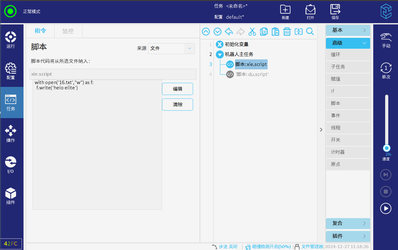 例如,用户希望对/home/elite/user/program 下的 16.txt 文件在机器人脚本中进行读写。此方法适用于软件版本 2.5 及以上!!