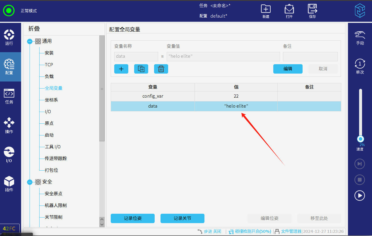 针对真机可以使用如下代码。执行完该代码,用户可以/home/elite/user/program 下看到16.txt 的内容被改写(data为示教器创建全局变量数据)
