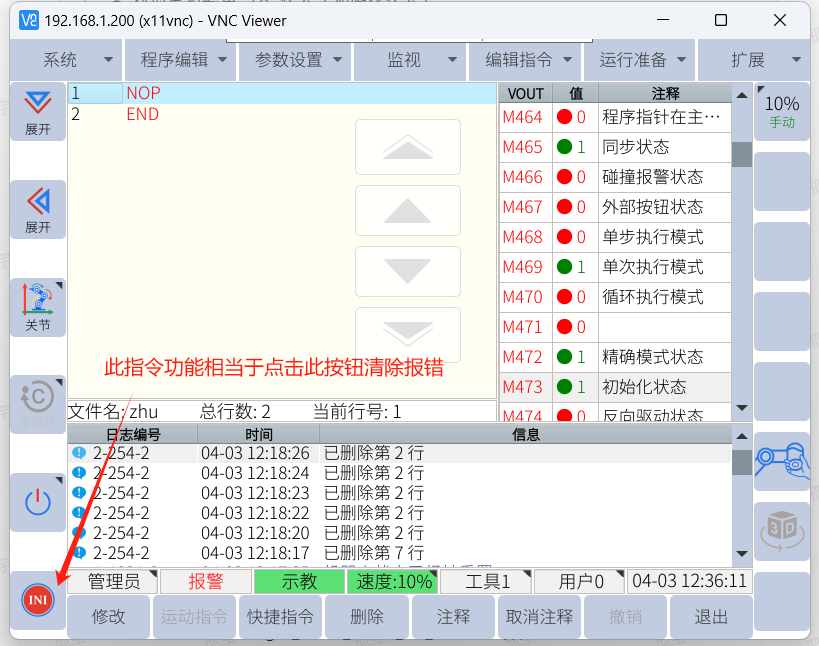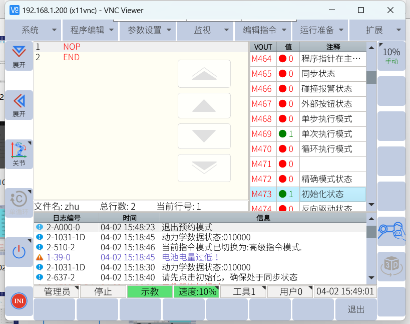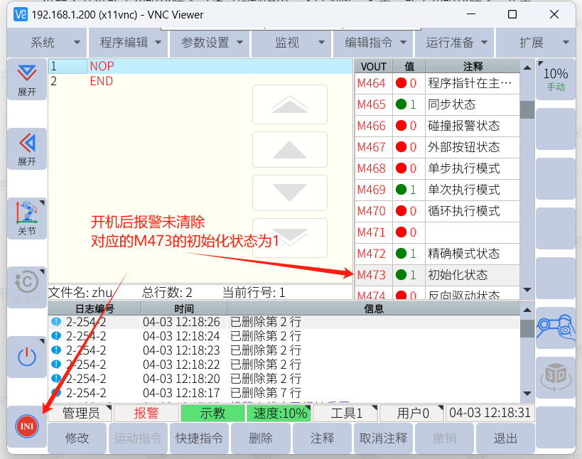 机器人开机处于初始化状态(通过虚拟输出 m473 判断,1 表示未完成初始化状态,0 表示完成初始化状态),指令函数可使用getVirtualOutput。