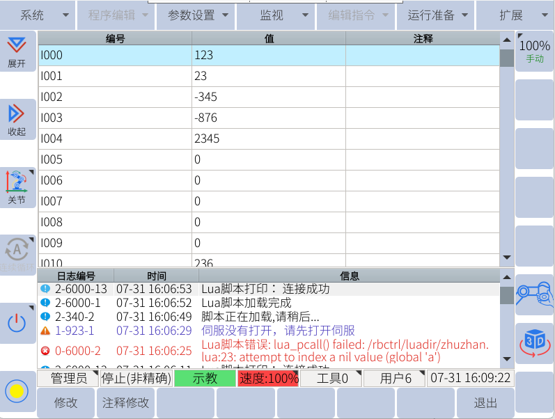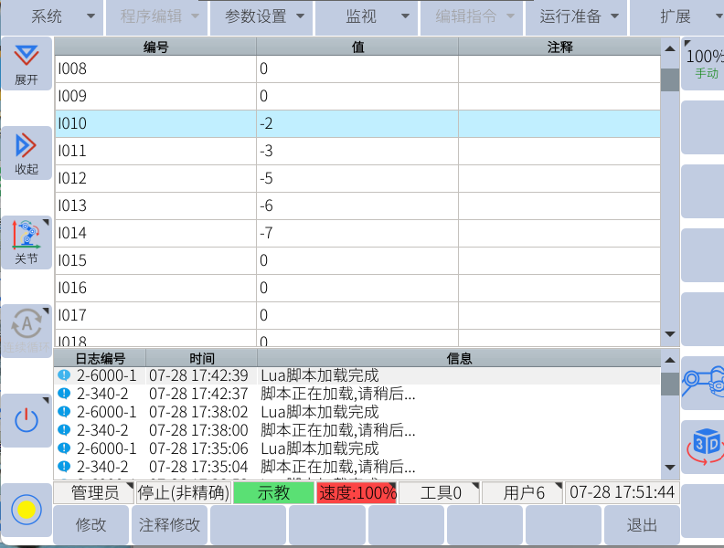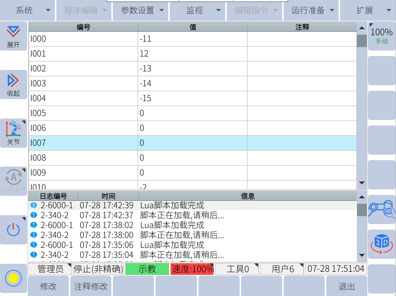 通过助手向寄存器300-304赋值,可通过示教器查看I0-I4数值,确实数值是否正确,如下图所示