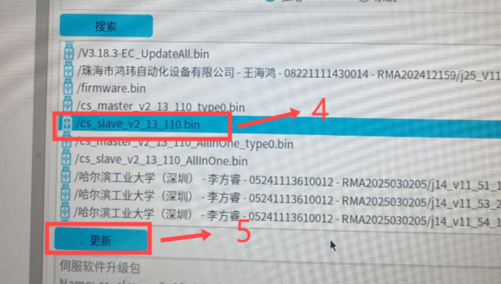 ● 选择辅MCU:CS_slave_v2_13_110.bin,并点击“更新”,如下图。