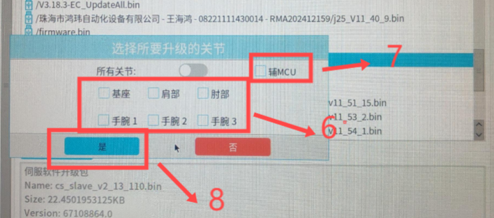 ● 点击更新后,会弹出如下的对话框。选择对应”关节”,勾选辅MCU,并点击”是“,等待升级完成即可。(主MCU升级与辅MCU操作方式一致,但不能勾选辅MCU)