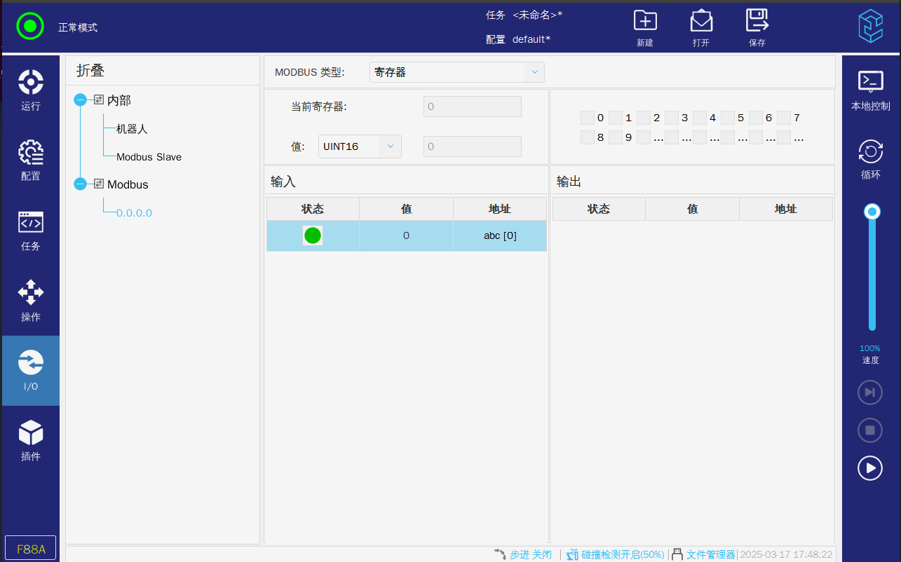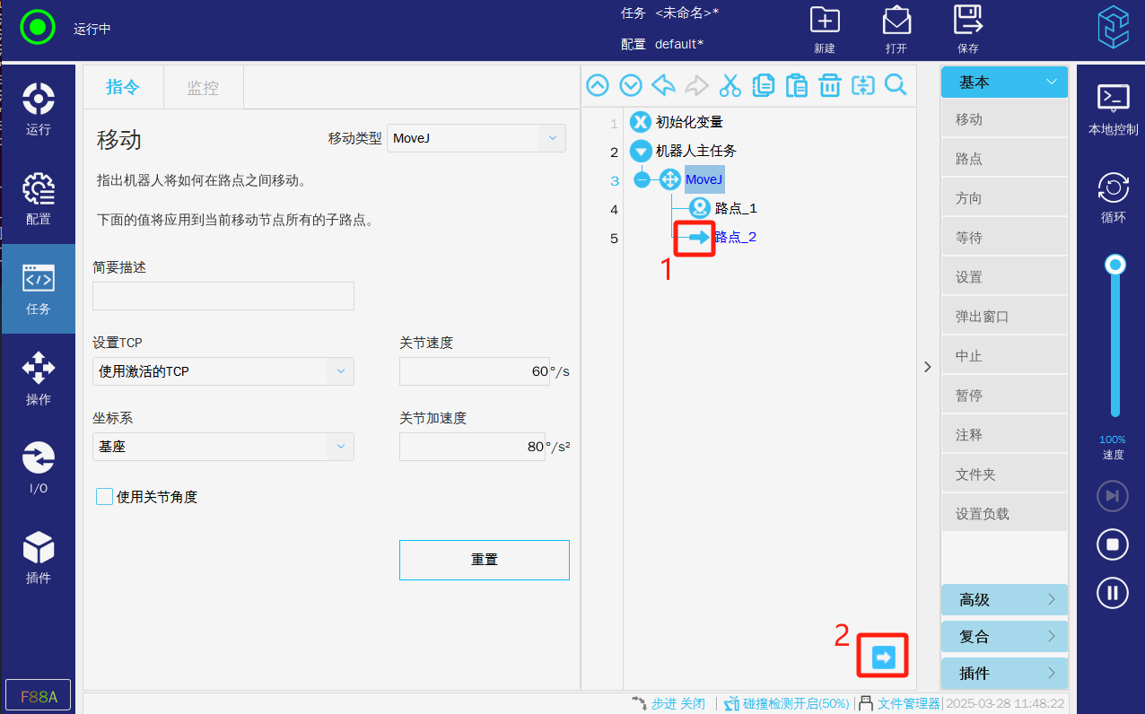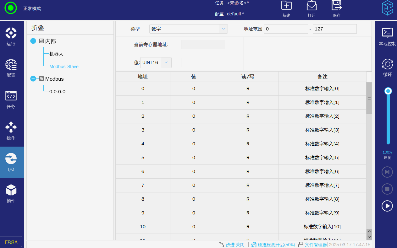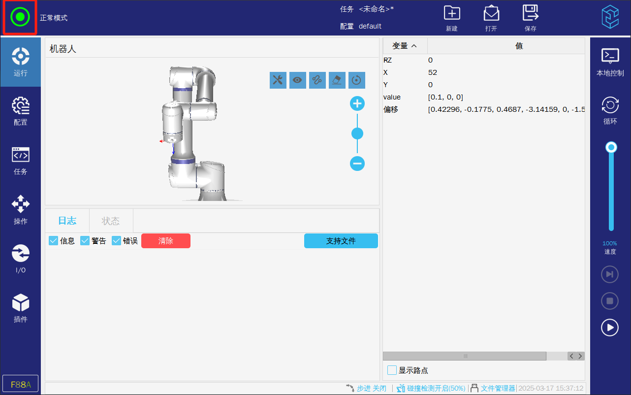 2.运行模式,如果是正常模式则需要让任务运行(左上角处于“运行中“),则机器人才会根据任务来执行需要动作。