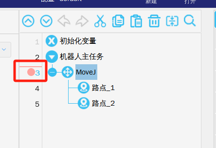 在处于任务运行中的时候机器人如果没有任何动作也无报警可以查看对应任务的程序指针,通过指针查看当前程序执行在哪一行(比如以上程序目前是在处于等待指令行),由此来判断不动作的原因。位置1是程序指针,如果找不到位置1的程序指针,可以点击位置2,该位置是表示跟踪到程序指针位置1.
