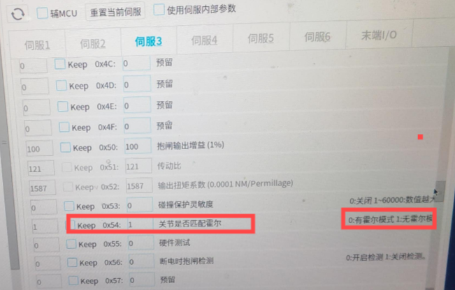● 找到对应的关节,屏蔽0x54=1(0:有霍尔,1:无霍尔),0X03修改为5保存。