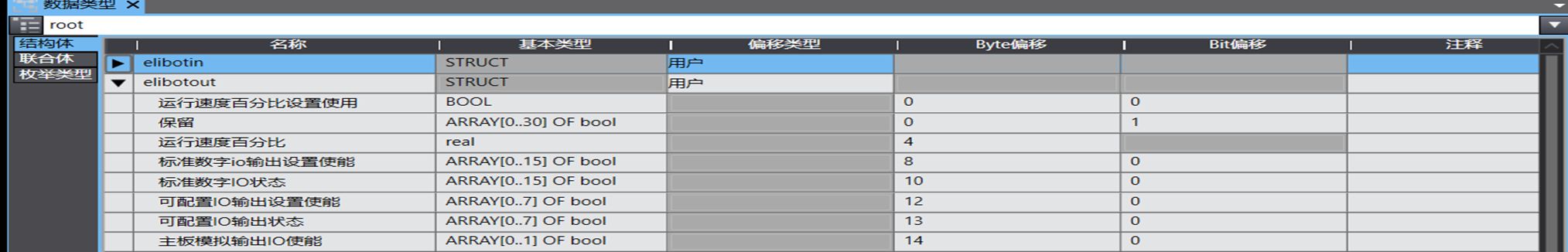 基本类型可以自己选择,像0-31这个四个字节有用的只有运行速度设置使能,也可以直接改成数组类型的四个byte【ARRAY[0..3]OF byte】,使用时就只需要给第一个字节的第一位设置值也可以。根据使用习惯来配置类型,像下图中把使能设置配置成bool占1位,保留配置0-30个bool,31位是从第一个字节的第一位开始偏移,所以bit偏移是要填写1