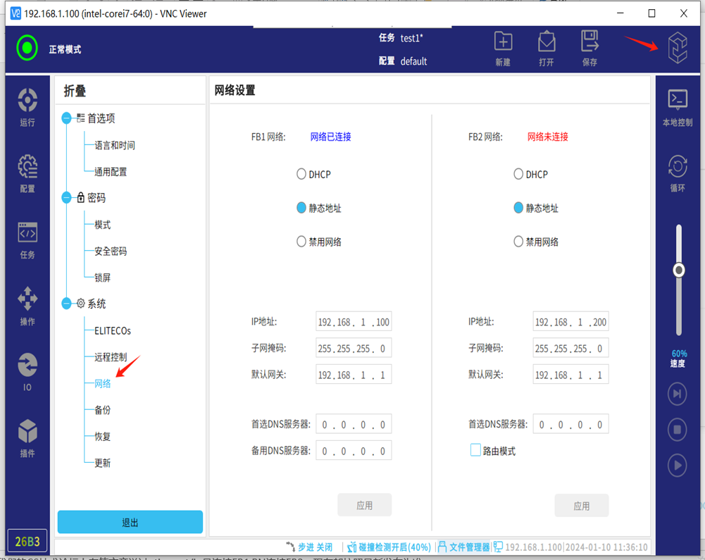 l点击机器人右上角【 logo 】-【设置】-【网络】设置FB1的网络IP,需要与PLC同网段。