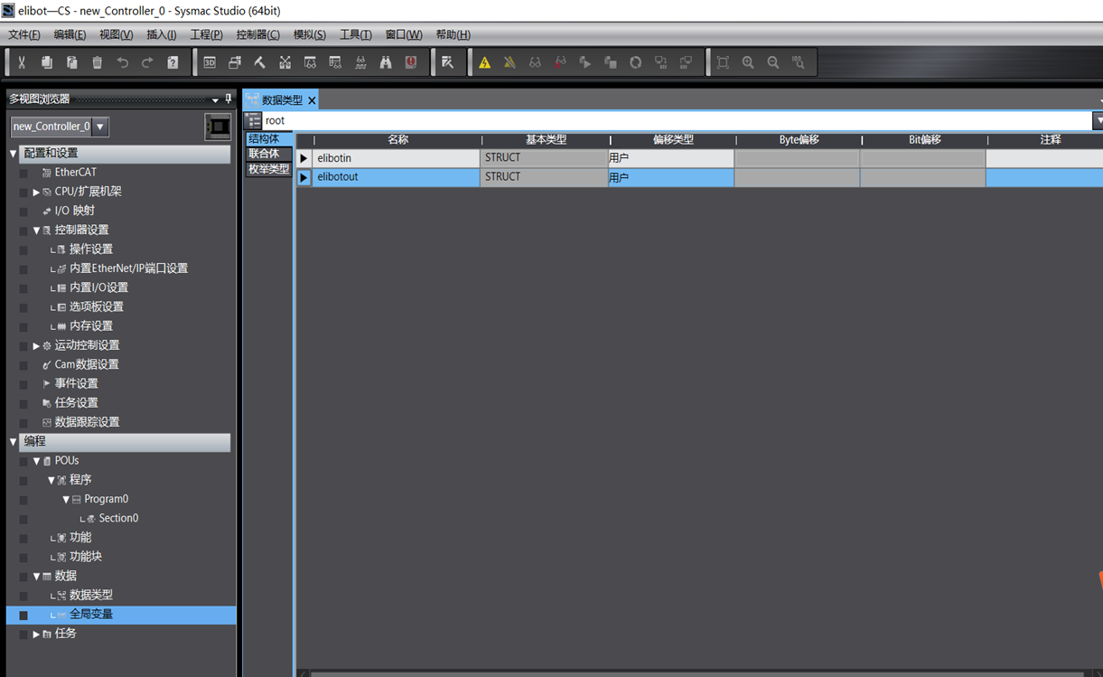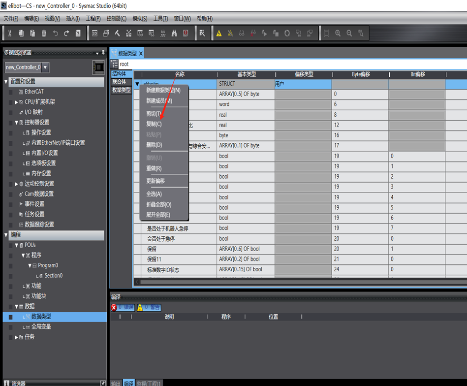 2.可以在数据类型处直接复制数据结构体,粘贴到一个记事本里面去,需要用时ctrl+a全选复制,在Sysmac Studio-数据类型界面粘贴回去即可,注意复制出来的内容不可以删减,需要删减,粘贴进Sysmac Studio后在删减,否则会出现粘贴不进去的情况。